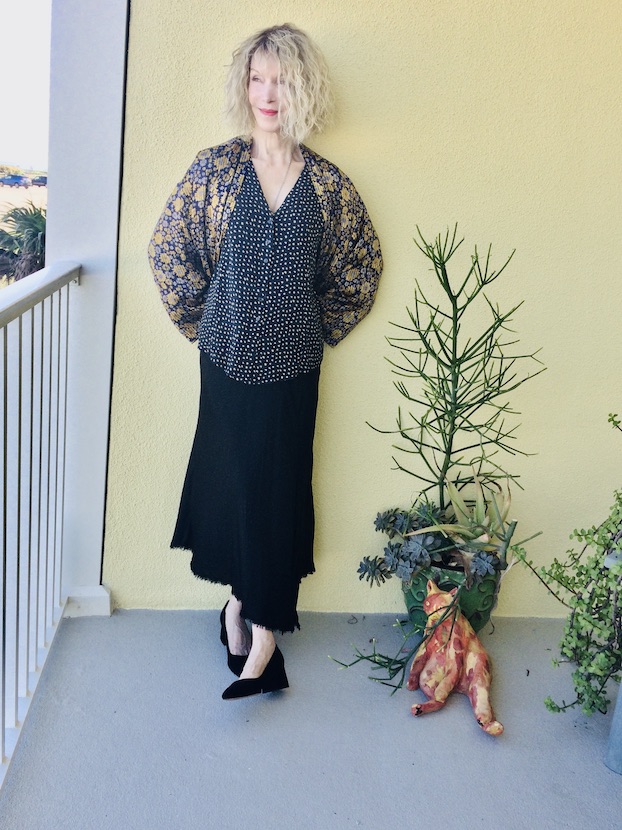 The polka dot blouse by Mango was thrifted locally. A deep vee neckline is the most flattering shape for me – which neckline is your personal favorite? And the black skirt is truly a blast to wear, with its distressed, asymmetrical hemline and soft drape. It’s by Nation LTD and another Nuuly rental piece for January.