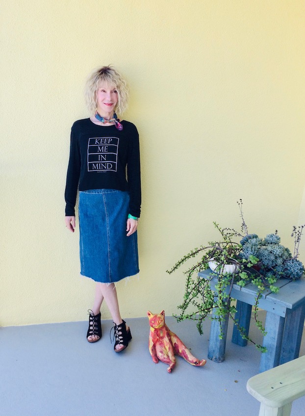 It might be too literal to wear the message on your shirt, but hey, I’m retired and now is my time.😊 This graphic tee was thrifted in NYC. The tiny print below the message says “now and then”. It’s in my favorite color, heh, and works with every skirt or trouser in the closet. Today it’s a thrifted UNIQLO denim skirt that I shortened the easy way: with scissors and a wash in the machine.