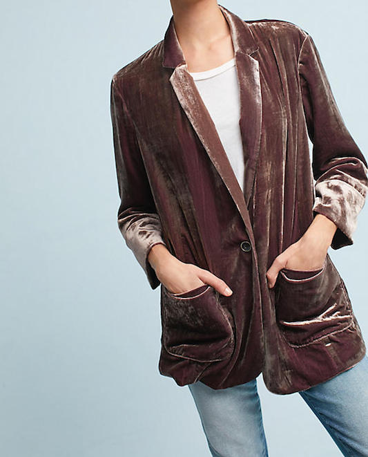 Velvet. I’m on the hunt for a velvet jacket. I just love the feel of the fabric, and whether it’s pricey or thrifted, it looks rich. I am crazy for this slightly oversized version, in an unexpected, iridescent neutral. This one‘s from Anthropologie.